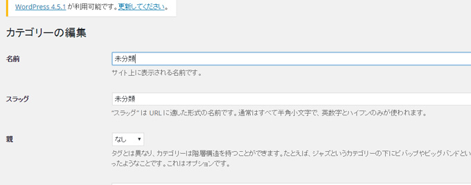 カテゴリ編集画面に遷移するので、名前、スラッグ、親となるカテゴリを選択します。